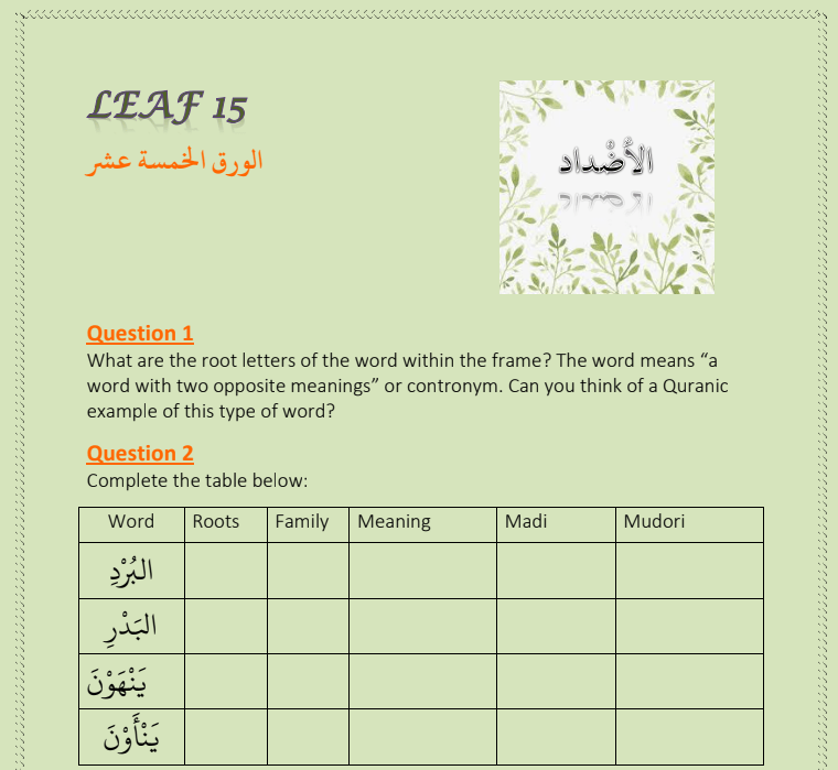 Leaf 15 Leaf 15 February 22, 2020 by jameelabee Topic: Root letters, Grammatical Analysis View full document here Related